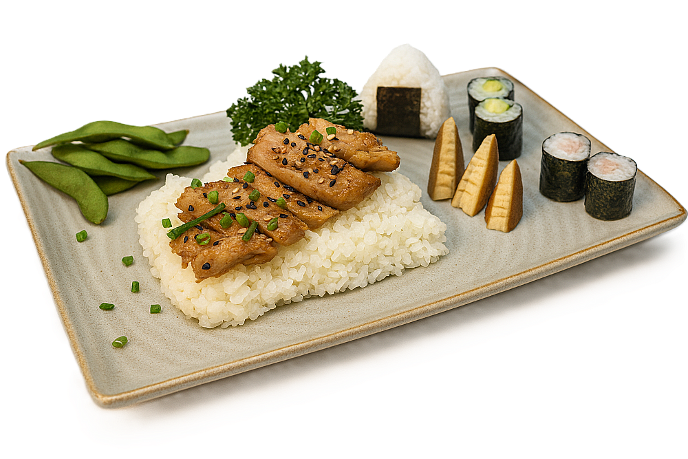 riservato agli under 12: pollo in salsa teriyaki, riso, 4 hosomaki (avocado e ebi), 1 mini onigiri (nami), edamame* e ½ dorayaki