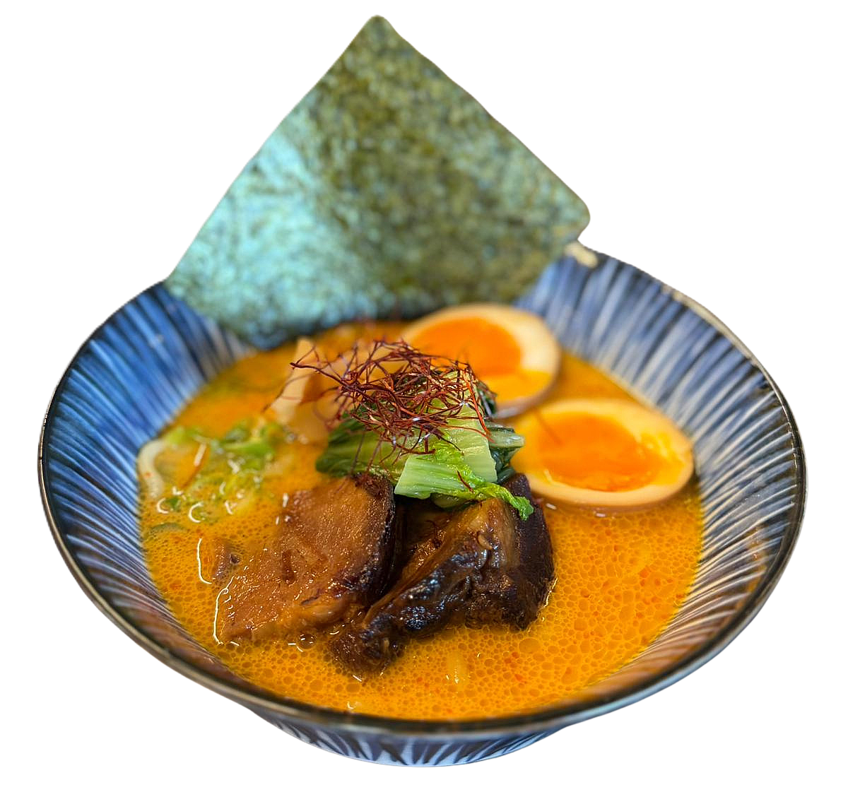 noodles di grano in brodo di carni miste, con chashu (coppa di maiale brasata), ajitama (uovo marinato mi-cuit), pak choi, aonegi (green onion), menma (germogli di bambù marinati), olietto all'aglio e peperoncino, spezie giapponesi.