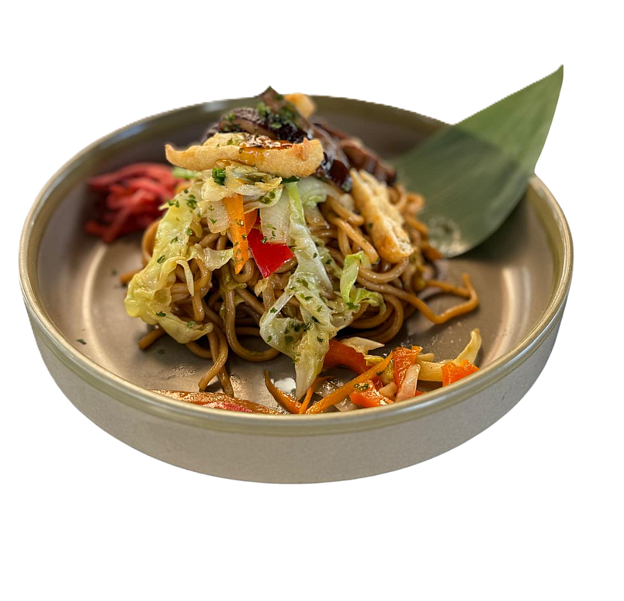 Noodles di frumento alla piastra con tofu fritto e verdure croccanti, serviti con salsa tipica giapponese e beni shoga (zenzero rosso marinato).