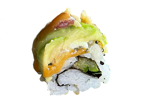 con avocado, daikon marinato, chutney di cipolla rossa e granella di mandorle
